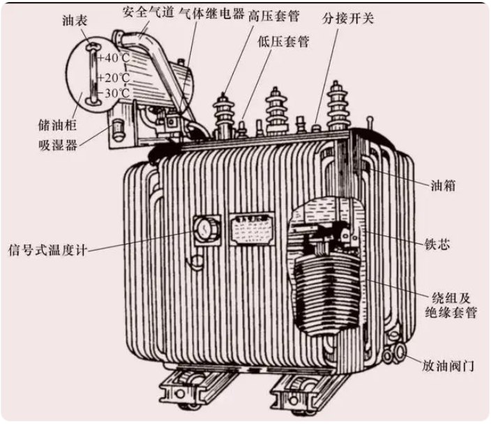 (3)油箱和冷卻裝置 油浸式變壓器的器身浸在充滿變壓器油的油箱里。變壓器油既是絕緣介質,又是冷卻介質,它通過受熱后的對流,將鐵芯和繞組的熱量帶到箱壁及冷卻裝置,再散發到周圍空氣中。