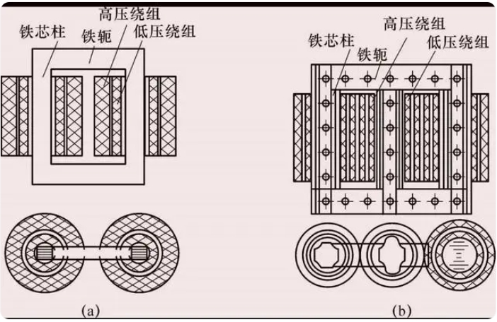 圖1.3 芯式變壓器繞組和鐵芯的裝配示意圖 (a)單相;(b)三相