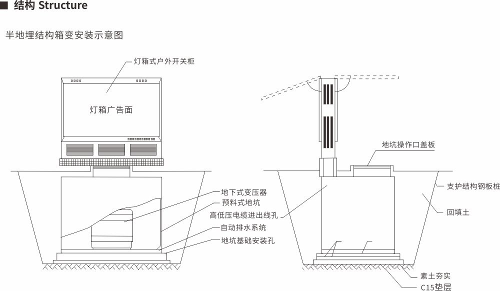 景觀式地埋變主要由地埋式變壓器和廣告燈箱式的戶外開關(guān)設(shè)備組成。地埋式變壓器是由變壓器、高壓負荷開關(guān)、熔斷器等組合在一起的一種新型的緊湊型變電設(shè)備,它安裝在地坑中,不占用地表空間,而且能在一段時間內(nèi)浸沒在水中運行。廣告燈箱式的戶外開關(guān)設(shè)備為集廣告牌及戶外開關(guān)設(shè)備為一體的混合結(jié)構(gòu),安裝在地面。箱體內(nèi)部為戶外高低壓配電柜,兩側(cè)為廣告燈箱,具有極佳的視覺效果。