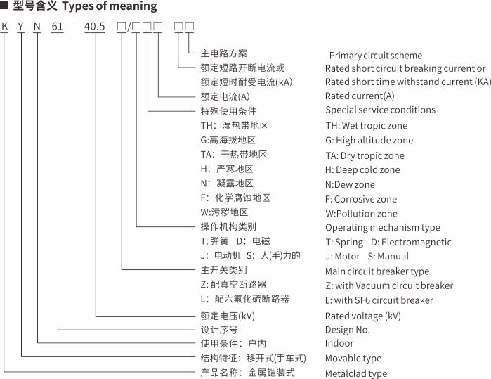 KYN61-40.5開關設備使用在40.5kV三相交流50Hz電力系統中,作為發電廠、變電所及工礦企業的配電室接受與分配電能之用;對電路具有控制、保護和監測等功能。除廣泛用于一般電力系統,還可以使用于頻繁操作的場所。本產品符合GB3906《3~35kV交流金屬封閉開關設備》:GB/T11022《高壓開關設備和控制設備標準的共用技術要求》、IEC60298,IEC62271-200《額定電壓1KV以 上52KV及以下交流金屬外殼開關設備和控制設備》、IEC60694《高壓開關設備和控制設備共用條款》標準的要求。