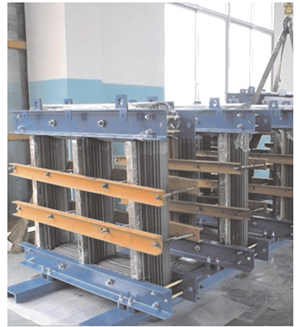 鐵芯由拉螺桿適度夾緊,無沖孔,上、下夾件由拉板連接并與底座固定為一體,繞組通過彈性墊塊固定,緩沖結構可減輕繞組的震動程度和降低噪聲。