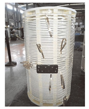 高、低壓線圈選用Nomex? 絕緣材料,并經VPI真空加壓設備多次浸漬無溶劑浸漬漆,并多次高溫烘焙固化。高壓線圈采用機械強度高,散熱條件好的連續式結構,避免了多層圓筒式線圈層間電壓高,散熱能力差、容易熱擊穿,以及機械強度低的缺點,從而提高了產品運行的可靠性;低壓線圈采用箔式或縱向氣道大電流螺旋式結構。浸漬后的線圈防潮性能極佳,更能承受沖擊,永無龜裂,無局部放電,壽命期后易于分散回收,保護環境。