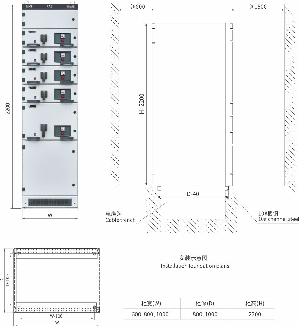 安裝MNS系列開關柜屬非靠墻垂直安裝,其后面為柜體的出線電纜溝,為便于維護,后面距墻通常為800~1200mm,正面距離安裝見下圖。