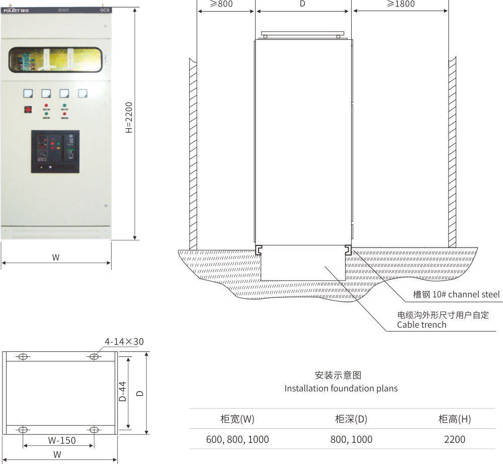 安裝GCS系列開關(guān)柜屬非靠墻垂直安裝,其后面為柜體的出線電纜溝,為便于維護(hù),后面距墻通常為800~1800mm:正面距離安裝見下圖。
