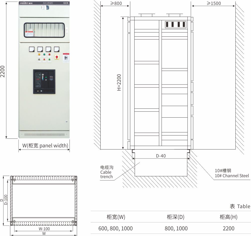 安裝GCK(L)系列開關柜屬非靠墻垂直安裝,其后面為柜體的出線電纜溝,為便于維護,后面距墻通常為800~1200mm:正面距離安裝見下圖。